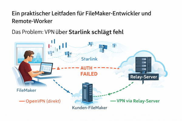 Als FileMaker-Entwickler arbeite ich regelmäßig remote an Kundenprojekten. Der Zugriff auf interne FileMaker-Server erfolgt dabei manchmal über OpenVPN. Das funktionierte über Jahre hinweg problemlos, bis ich auf Starlink als Internet-Provider wechselte.